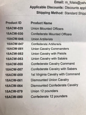 Also the Old Glory order came through. I needed Cavalry and Artillery. Hopefully only one more order will be needed. Once everything is painted and rebased, I will order the missing components.