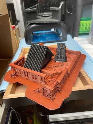 The tile that matches up to the Church section has all the roads down. A "Matte Vintage Grey" rattle can was used as primer. The blue tape is covering the building numbers. Just like your house every building has a number. It is important for a fast set up and each building is slotted for that spot exactly.
